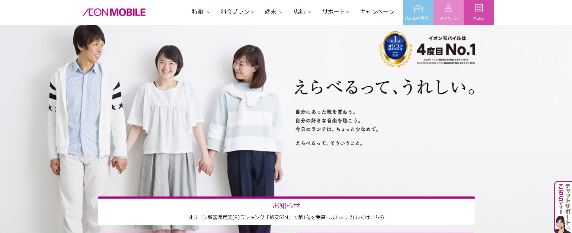 イオンモバイル | 1GB528円~ | 1GB858円~ | 60.06Mbps | docomo回線/au回線 | × | ◎ | ◎ | チャット・実店舗 |