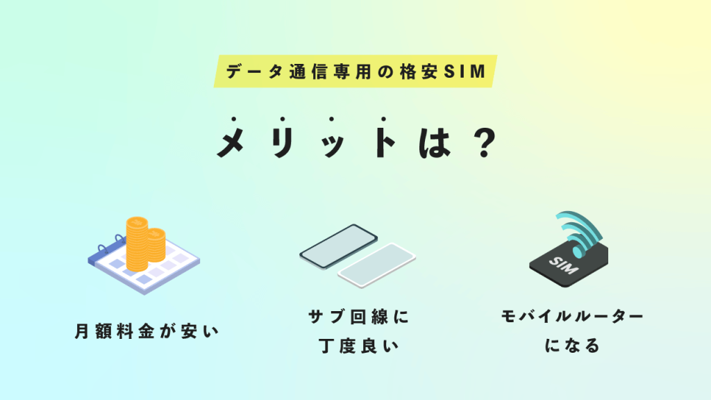 中でもデータ通信専用SIMはできることが最もシンプルですが、メリットもたくさん挙げられます。