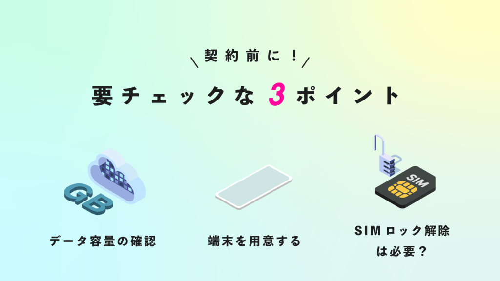 データ通信専用SIMを契約する前にチェックしておきたいポイントは3つほどありますので、格安SIMの契約で損をしないためにもぜひ一度確認してみてくださいね!