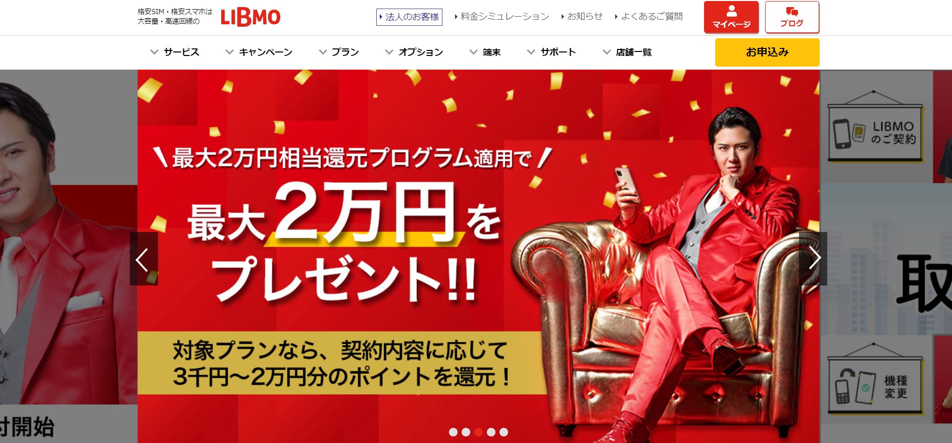 内容 | 新たにLIBMOにお申込みいただき「1ランクUPキャンペーン」を適用される場合、 月額利用料から毎月最大670円(税込737円)を最大6ヶ月間割引します。 新たにLIBMOをお申込みいただき「サンキュー60GBキャンペーン」を適用される場合、 月額利用料から毎月最大1,790円(税込1,969円)を最大6ヶ月間割引します。 |