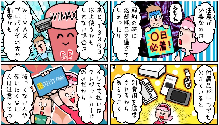 解約申し込み時に伝えられた期日までに必着で、WiFi端末やそのほかの付属品もすべて揃えて返却しなければならない点に注意しましょう。