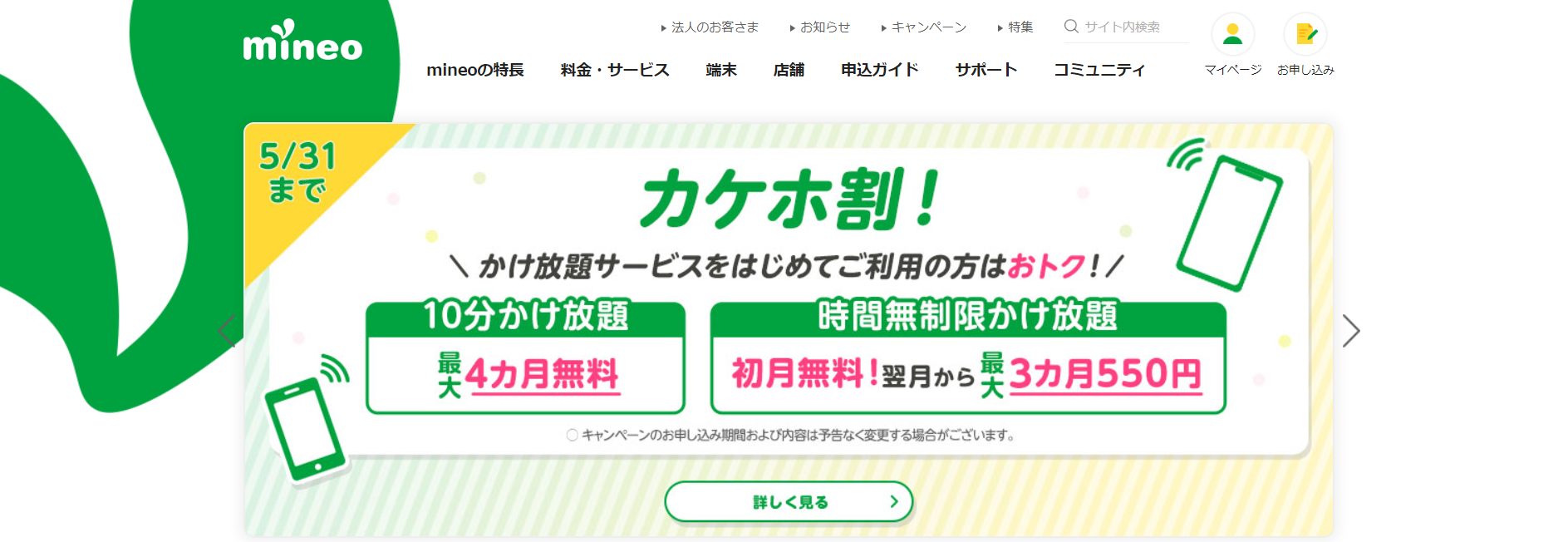 mineoでは2023年8月時点で「カケホ割」と呼ばれるキャンペーンを実施しており、2024年3月31日までのオプション利用で10分かけ放題、時間無制限かけ放題の利用開始月の月額料金を無料で利用できます。