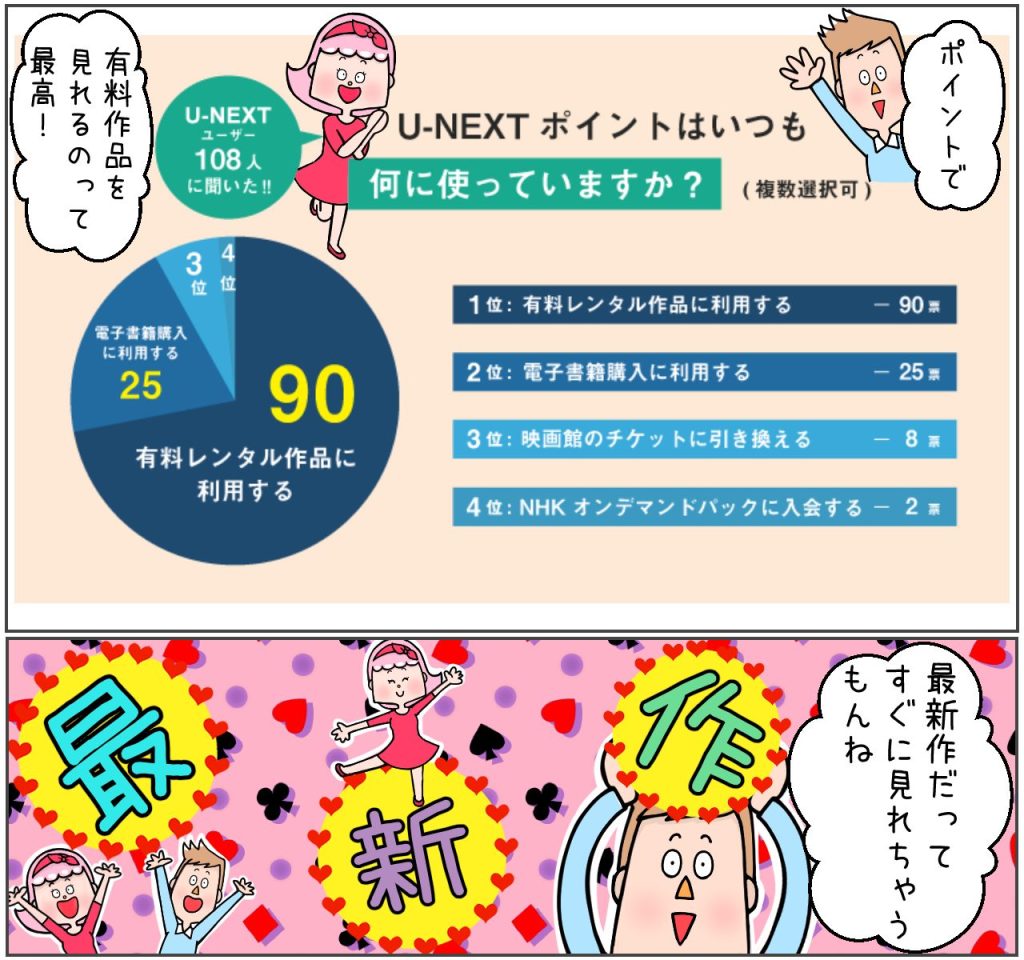 U-NEXTはポイントを使わない見放題の作品が圧倒的に多いですが、レンタルが開始された最新作もポイントを利用して、見ることができ、その点も入会している人に人気でした。
