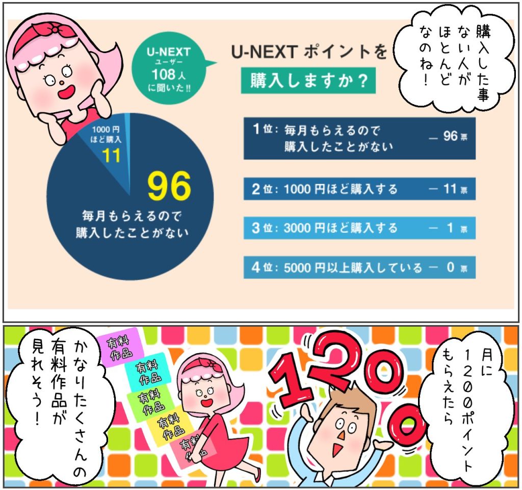 U-NEXTのポイントをコンビニなどで買っている人もいましたが、口コミにもあるように、毎月もらえるポイントで十分の人が多いようです。