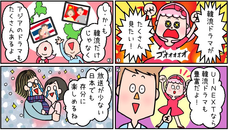 とにかく韓国ドラマの配信数が多く、しかも良作の独占配信が多いので、他の動画配信サービスでは見られないドラマが見られるのが魅力です。本編放送分だけではなく、ドラマに関連した特番が見られたりするのもうれしいサービスです。