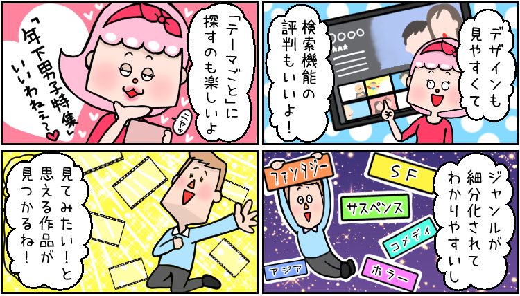 他のアプリよりも探しやすいのと、自分が見たい作品が良く配信されるのでとても便利だと思います。