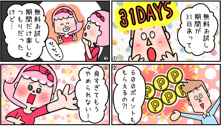 31日間のお試し期間があるため、他のサービスと比べながら入会まで慎重に検討できました。お試し期間中に、作品が私好みのものが多いことがわかり、これから追加されて行く作品にも期待できると感じたので、入会を決めました。